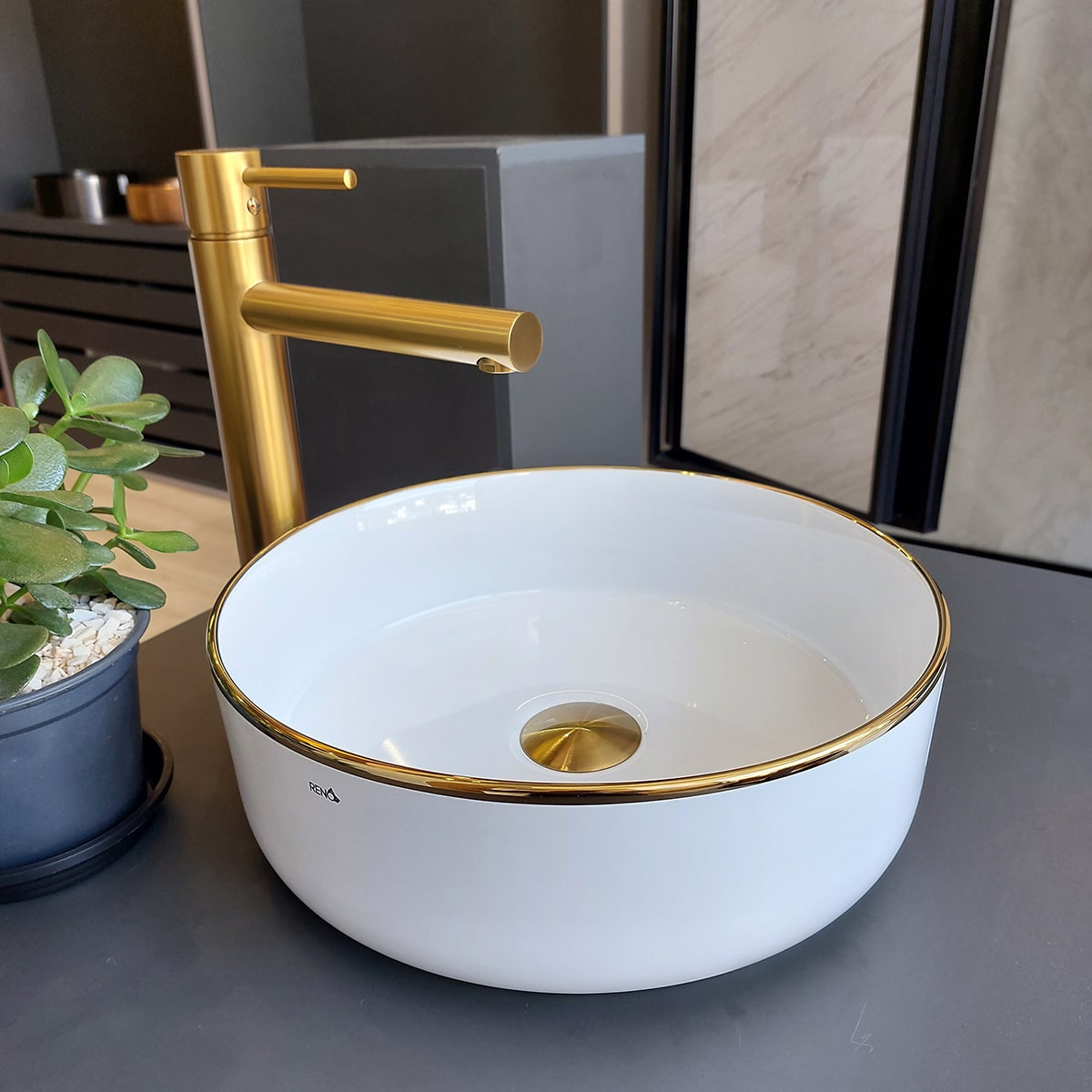 A Cuba de Apoio Redonda Branca Brilho com detalhe dourado combina a tradicional cerâmica branca brilhante com a modernidade das peças Reno. A escolha perfeita para elevar o estilo do seu banheiro! Esta cuba cerâmica branca, com acabamento brilhante, apresenta um design redondo e elegante, conferindo sofisticação ao ambiente. Destaque para as bordas finas e delicadamente contornadas por uma linha dourada, adicionando um toque de luxo e exclusividade.