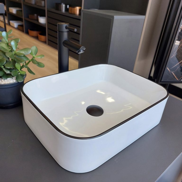 Cuba de apoio retangular branca com detalhe preto, a tradicional cerâmica branca de brilho com a modernidade das peças Reno!