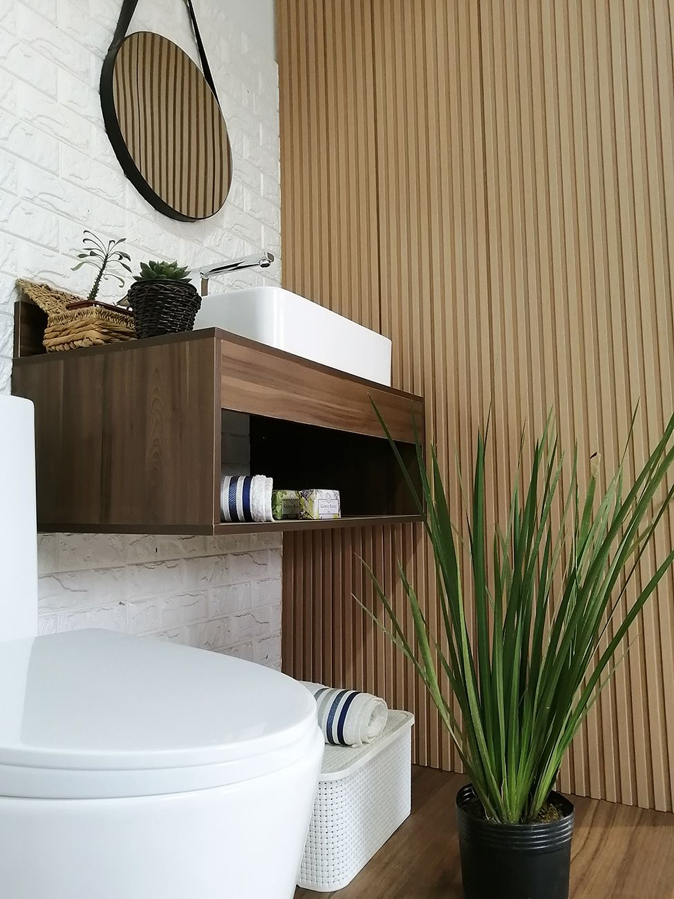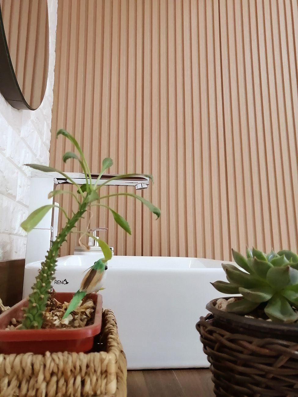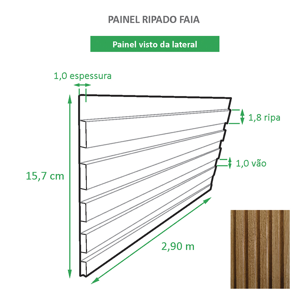 Material do Painel WPC – composto de madeira com resina plástica. Não mofa, não empena, não tem problema com umidade, não pega cupim e tem garantia de 5 anos.