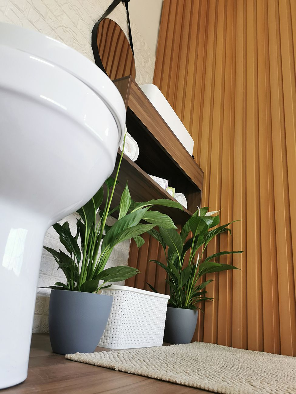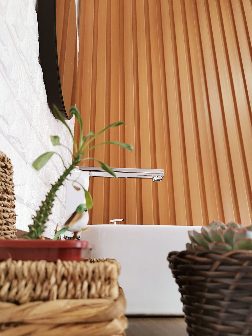 Material do Painel WPC – composto de madeira com resina plástica. Não mofa, não empena, não tem problema com umidade, não pega cupim e tem garantia de 5 anos.
