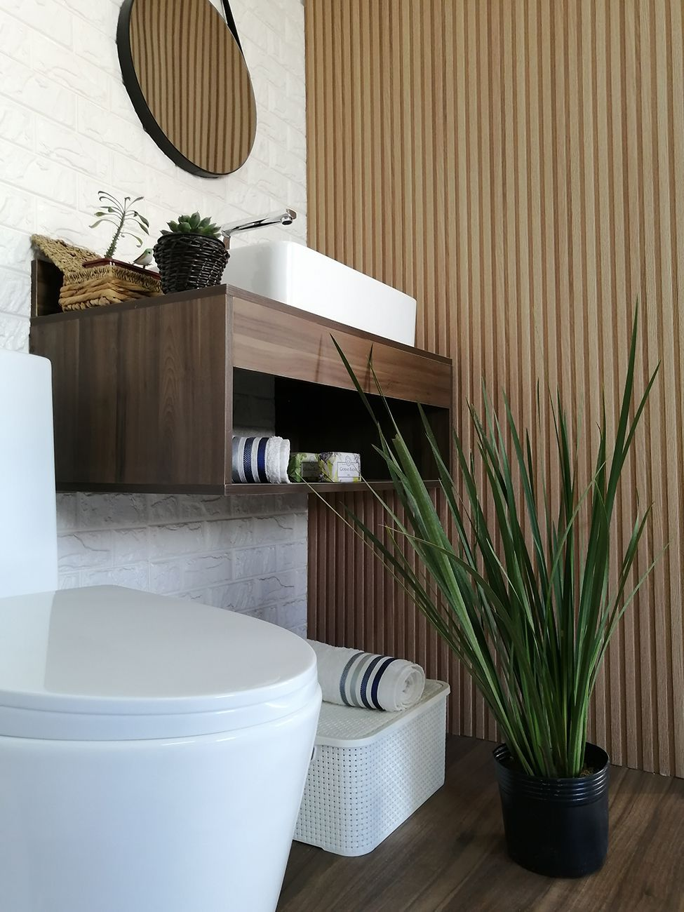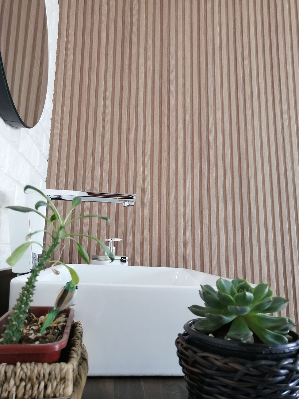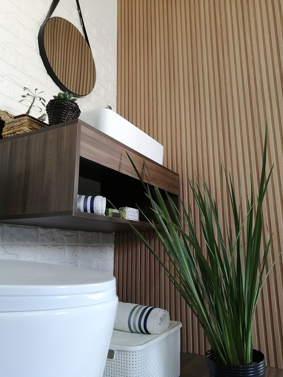 Material do Painel WPC – composto de madeira com resina plástica. Não mofa, não empena, não tem problema com umidade, não pega cupim e tem garantia de 5 anos.
