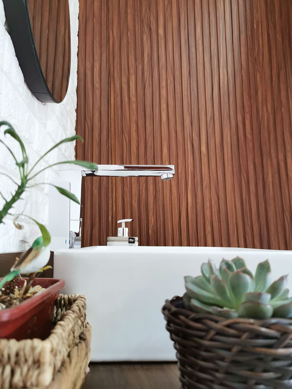 Material do Painel WPC – composto de madeira com resina plástica. Não mofa, não empena, não tem problema com umidade, não pega cupim e tem garantia de 5 anos.