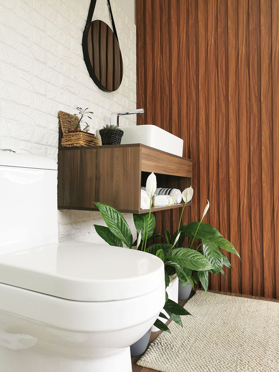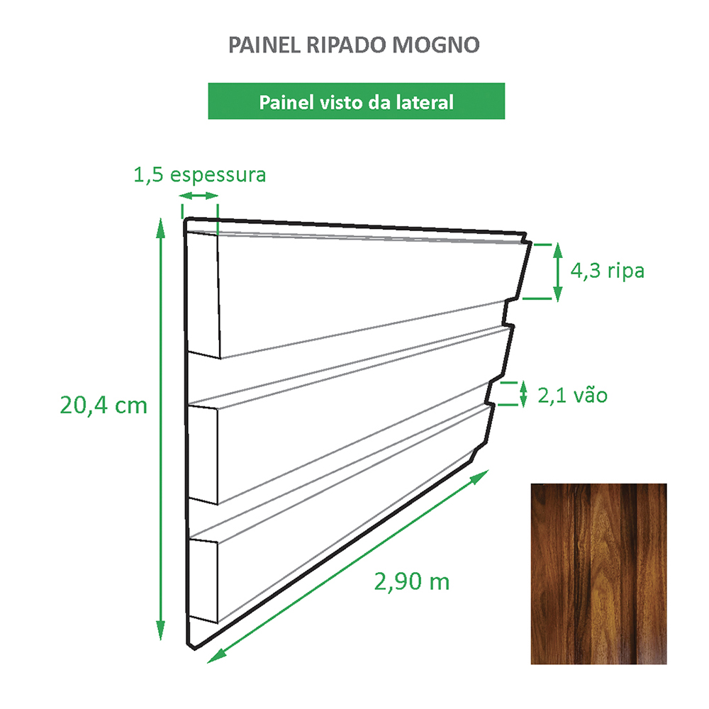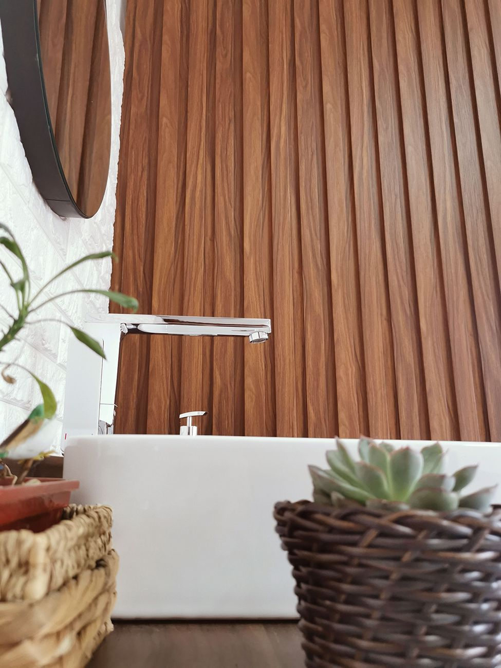 Material do Painel WPC – composto de madeira com resina plástica. Não mofa, não empena, não tem problema com umidade, não pega cupim e tem garantia de 5 anos.