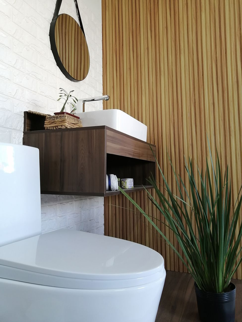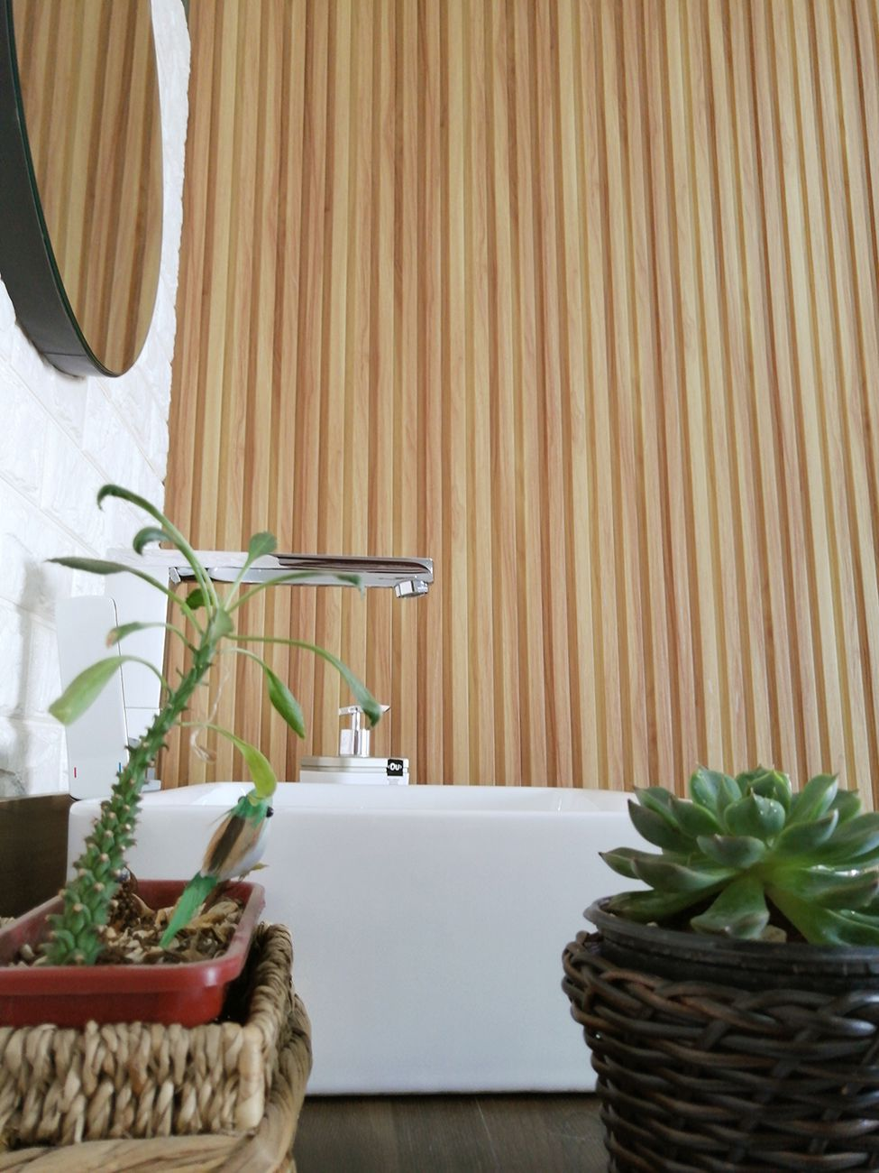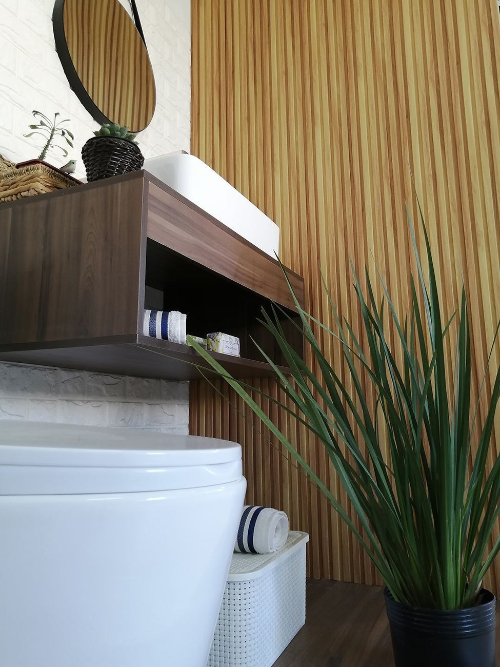 Material do Painel WPC – composto de madeira com resina plástica. Não mofa, não empena, não tem problema com umidade, garantia de 5 anos.